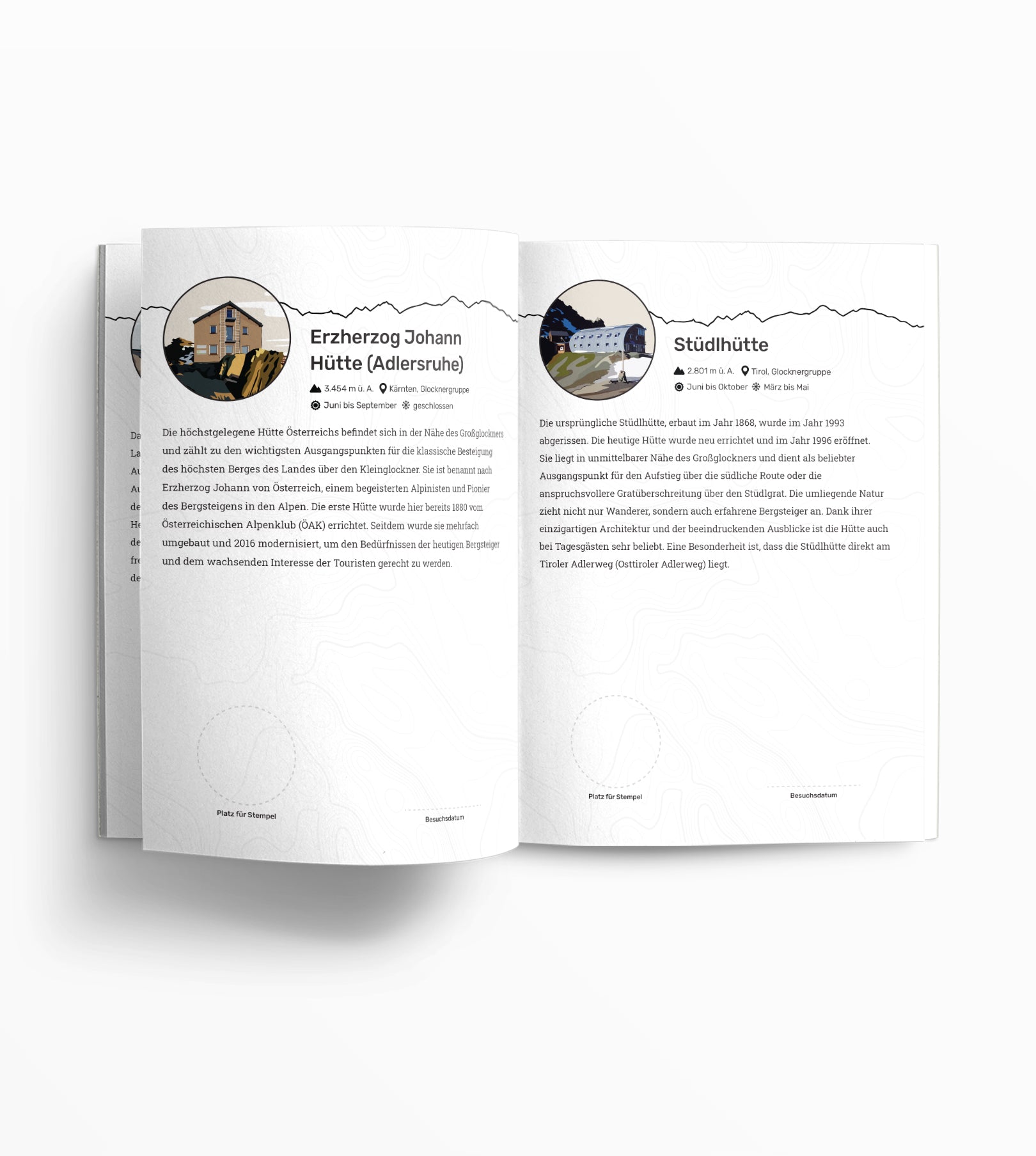 Jede Seite des Passes ist einer Berghütte gewidmet. Sie zeigt eine originelle Illustration, den Namen der Hütte sowie eine kurze Beschreibung. Natürlich gibt es auch einen Platz für den Stempel und das Eintragen des Besuchsdatums.